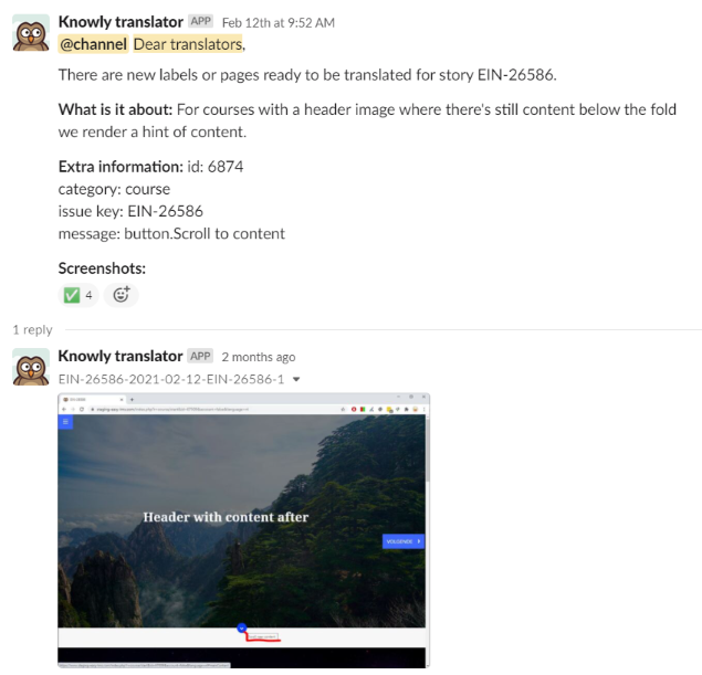 La tâche suivante consistait à communiquer notre défi et nos attentes aux traducteurs : réagir aux webhooks dès leur arrivée, idéalement dans les 24 heures. Nous étions curieux de savoir comment cela serait accueilli, mais l'équipe s'est rapidement adaptée. Slack est idéal pour les messages instantanés, un pouce rapide ou une coche. Nous avons ensuite rédigé un petit manuel de traduction pour expliquer comment nous voulions que les choses fonctionnent et pourquoi, et nous avons répondu à certaines questions courantes. Nous l'avons épinglé dans l'espace Slack pour que l'équipe puisse s'y référer en cas de besoin.
