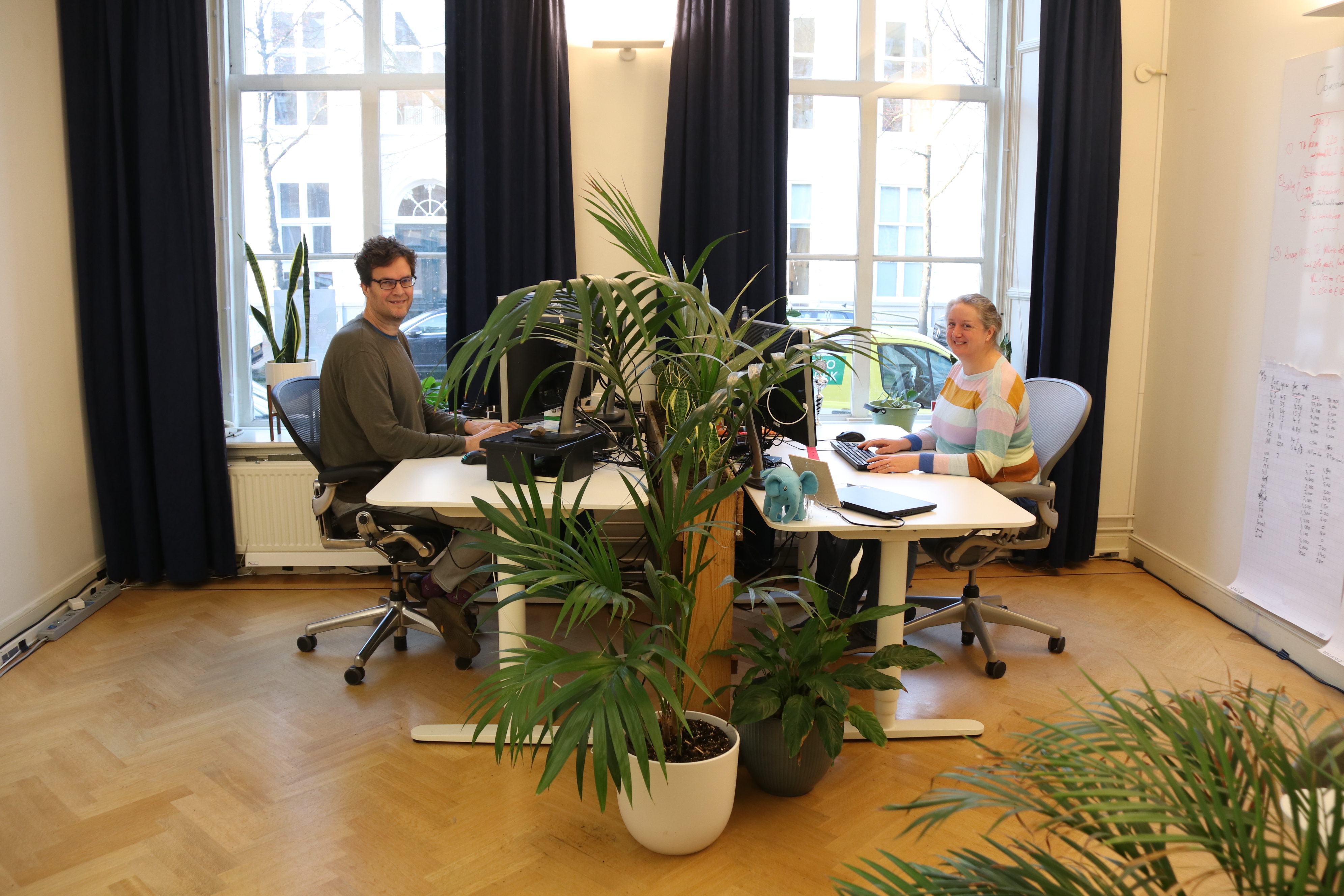 Dessutom gör vi allt vi kan för att skapa en trevlig och välkomnande atmosfär på vårt kontor. Vårt kontor är fyllt av levande grönska. Väggar täckta av växter, mosspaneler, hängande växter och rumsavdelare fulla av grönska. Växternas kraft hjälper oss att koncentrera oss och leverera ett högkvalitativt arbete. Vi har också ett avkopplande utrymme där du kan läsa i en bekväm stol eller njuta av vår månatliga massage. Behöver du fokusera utan några avbrott? Du kan välja ett kontorsrum eller vårt särskilda tysta rum. Även om många kollegor arbetar hemifrån har varje kollega ändå sin egen dedikerade arbetsyta. Det ger verkligen en känsla av att vara "hemma, ljuva hemma"!